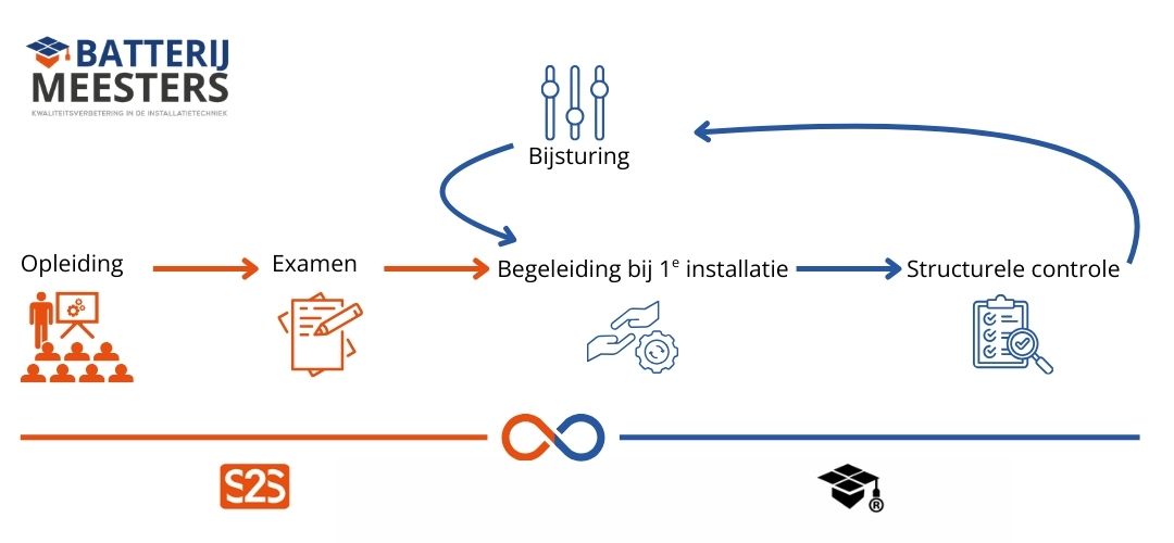 Onder de naam BatterijMeesters bundelen Switch2Solar en De Zonnemeesters hun expertise in één geïntegreerd implementatietraject. We begeleiden jouw team van opleiding en examinering tot de eerste installaties in de praktijk en daarna. Inclusief praktijkbegeleiding, kwaliteitsborging en advies voor continue verbeteren.